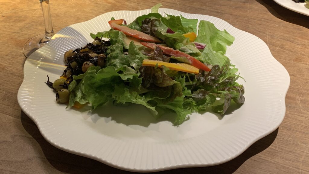 サラダはシャキシャキ野菜に、自家製のにんじんや果物を使ったドレッシングがかかっていて、最初から満足度が高め。